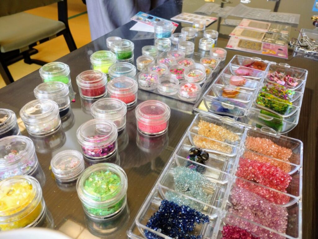 前回同様、まずは作りたい型を決めた後にパーツを選びます。レジンアクセサリーのパーツは小さくキラキラしたものがたくさん! ママと作業できる年齢のお子さんは、一緒にパーツを選ぶところから参加してくれていました。選ぶだけでも楽しくてワクワクしますよね。
